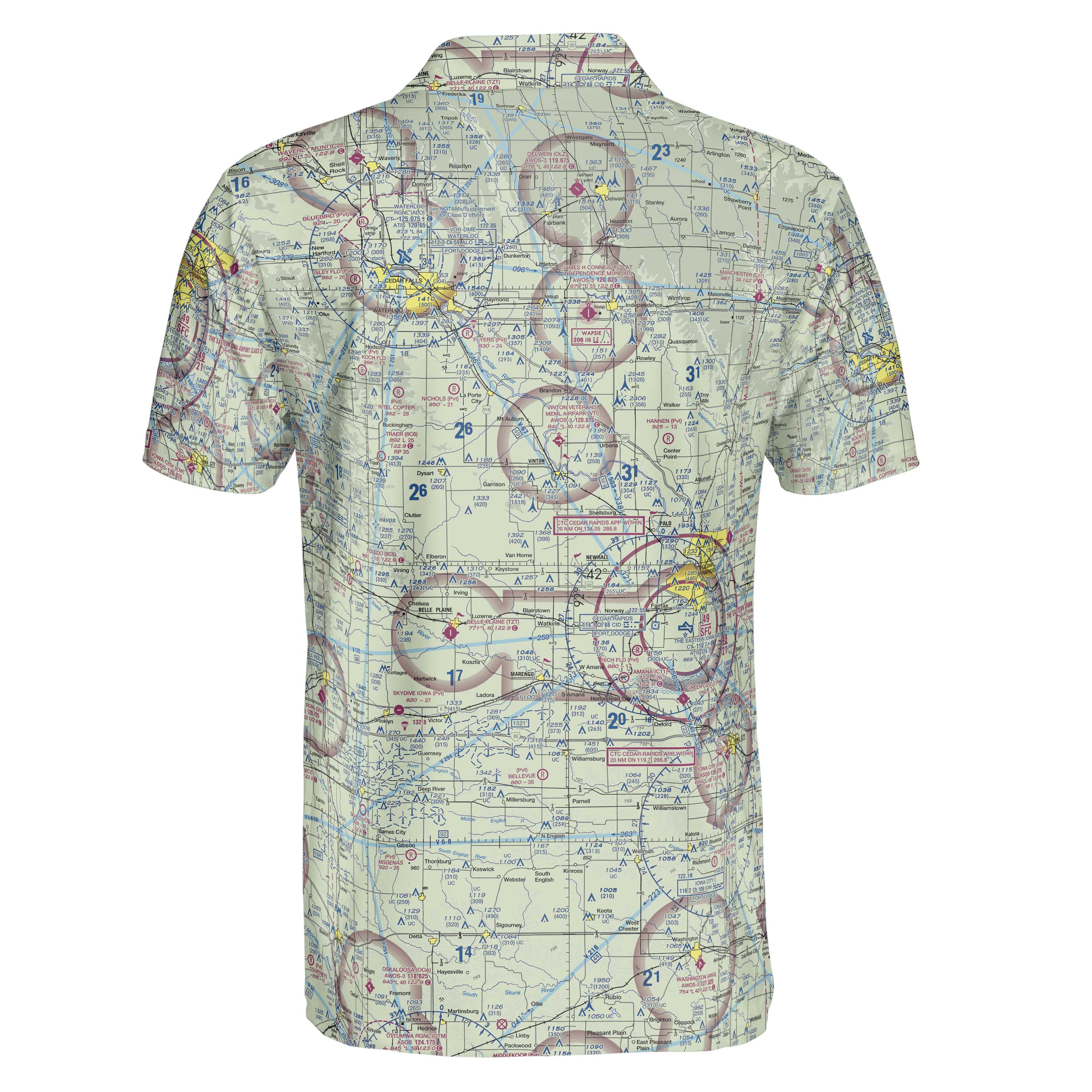 For those who love flying the Iowa skies we bring you this cool and comfortable polo shirt covering Cedar Rapids to Cedar Falls. Cleared for takeoff! Be sure to check the size chart against one of your favorite shirts to ensure a perfect fit! Please allow 2-3 weeks for delivery of your custom sewn-to-order shirt.