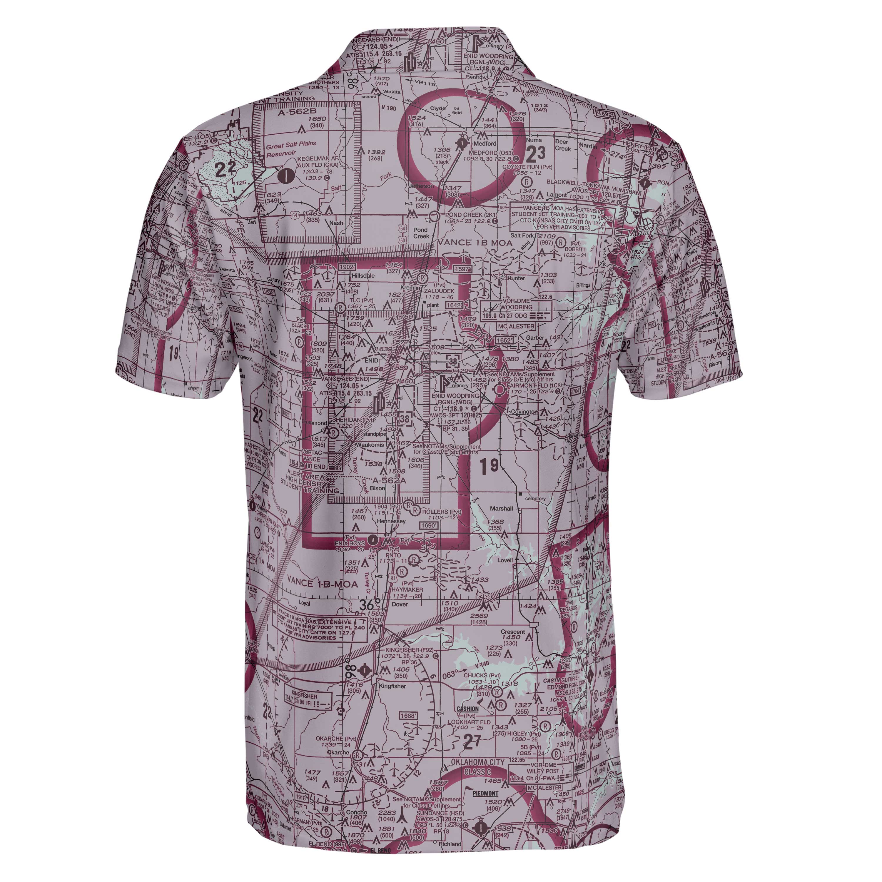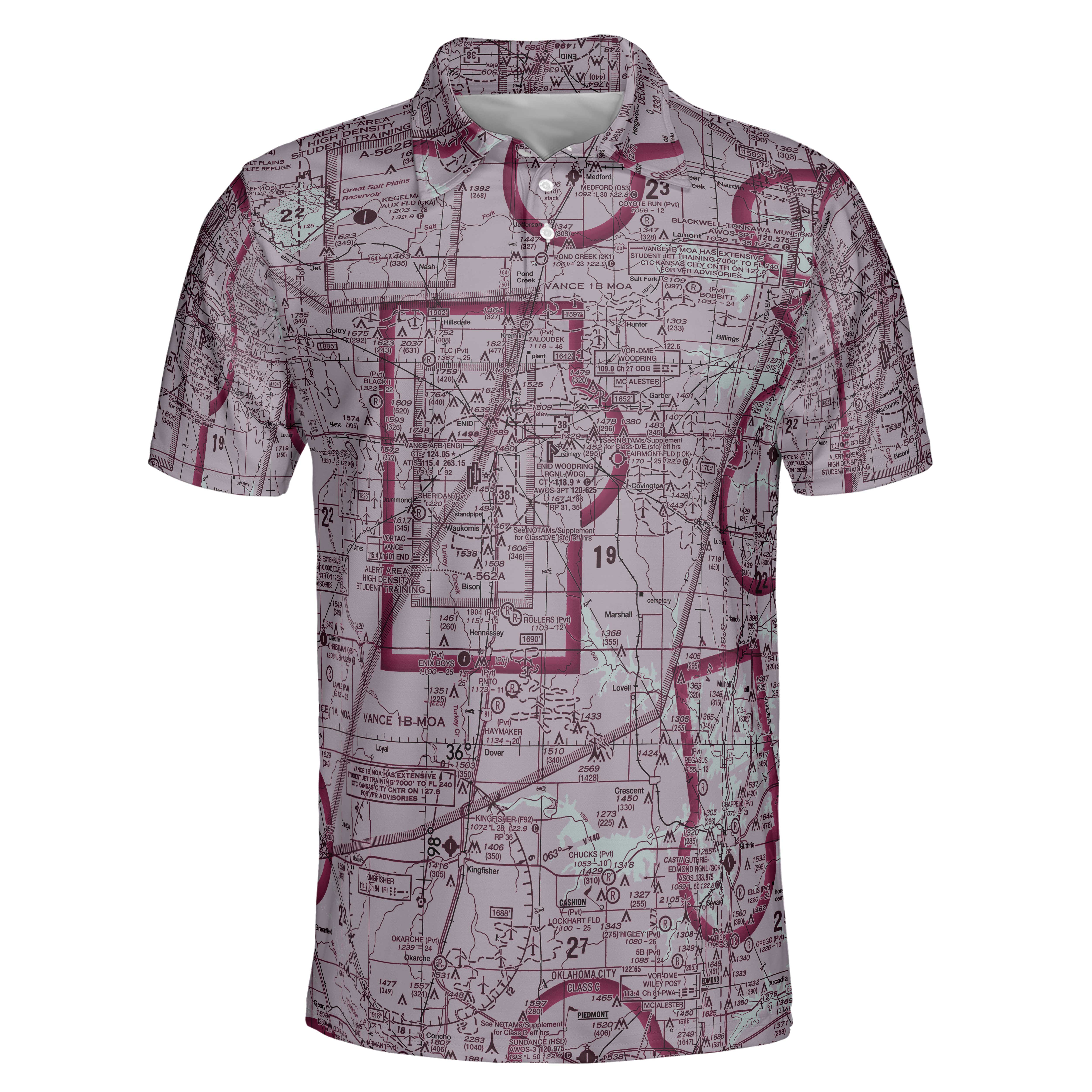 This unique VFR polo shirt features the area surrounding Vance AFB, OK. Whether you're at the airport or out on the town you're sure to get the attention of fellow aviators. Anytime is the best time to fly and we've got you covered in our Pilot Quarters original aviator shirt.